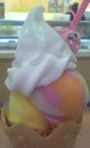 レインボーハット カップリッチコーンにバニラとオマケ。 商品は勿論店員のお姉さんも素敵なプロフェッショナルで大好きなレインボーハット。これだけ暑くなってきますとシャーベット系にシフトしていきます。 レインボーシャーベットは巨峰ソルベや白桃ピー…