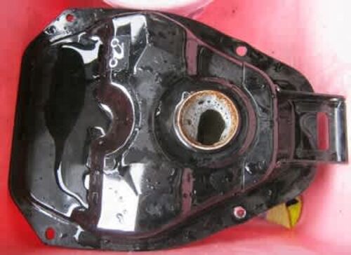 定番の塩酸系洗浄剤を使いました。 脱脂に丸1日、酸による錆取りに丸3日、水道水で洗ってアルカリ系洗浄剤で中和安定に3時間。水洗いの後天日に充てて自然乾燥。冬の気候では底の方の水が取りきれなかったのと、このあと即作業出来なかったのでCRCを吹いて…