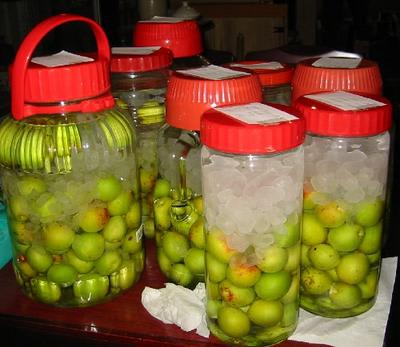 2006-06-27 浸けた梅酒の 酒 様子はこんな感じ。 匂いがほのかに香って美味しそうな実は、一部赤味が差しております。梅酒作りには青いうちの方が良いとよく言われるんですけどね。はたしてこの違いがどうでますか。 結局今年は2回、合計で梅27kg・焼酎40リットルを使いました。材料は兎も角、浸ける瓶の確保が一大事。一応家にあるのをかき集めて事足りたんですけどね。 来年以降も浸けるのは良いとして、これだけ在るのに瓶は買い足さないとならないんですよねぇ。今からそれが悩みの種。いや、別に悩みようもないか。買わなきゃ浸けられないもんね。