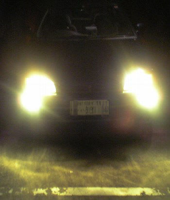 2006-10-26 黄レンジャー 車 フォグランプもイエローバルブに変えました。散光する光も写っちゃってるんで境目がありませんが。分かりづらい。 フォグもヘッドライト同様ライジングイエローなんで実際は真っ黄色です。手前の白線を見て頂けると、見易さを想像して頂けるのではないかと。