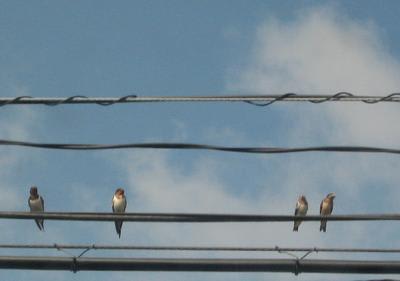 2007-06-23 つばめ2007 生きもの 今年家の軒下で産まれたツバメの雛たち。 今日、無事に巣立ちました。今年は今までで一番の少子化で都合三羽。写真は家の前の電線。 右側の二羽、ちょっと小さいのが子供達で、左大きめの二羽が親ツバメです。もう一羽は近場を飛行訓練中らしいのですが、じっと待ってるんでしょうね。 毎年のことなんですが、カラスや人間が撒く農薬なんかで巣立つまで気が気じゃないんです。今年もやっと、肩の荷が降りました。