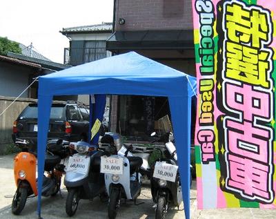 2007-07-28 特選中古車 その他バイク 日差しが強いのでタープを買いました。幟を立てて並べると、それなりにらしくなるでしょう? もともと利益は期待してないんだけど、あんまり動かないと家族の手前ばつが悪いです。大手を振ってバイク弄りが出来るようにちょっとくらい宣伝もしないとなぁと思っています。