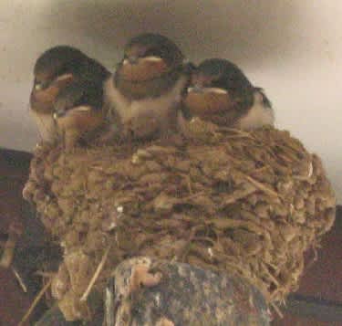 2010-06-21 ツバメ 生きもの 今にも巣立ちそう。 6/5に初めて顔を覗かせた雛達。孵ったのは4羽で、そのみんなが健在。今朝から親鳥は、餌を運ぶよりも飛来しては離れてと 飛翔を促しているようです。子供達も頻繁に巣の縁に足をかけて、巣は端から崩壊してきております。 午前中は雨と風という悪条件だったんですが午後からは強い日射しも差して巣立ち日和なんですが、どうかなぁ。無事に巣立ってくれると肩の荷が下りるんですが。