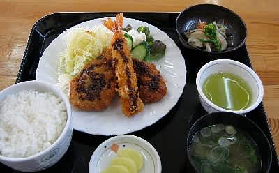 午後1:15頃、ファミリーパークでお馴染み海老・鰺・コロッケのミックスフライ定食。