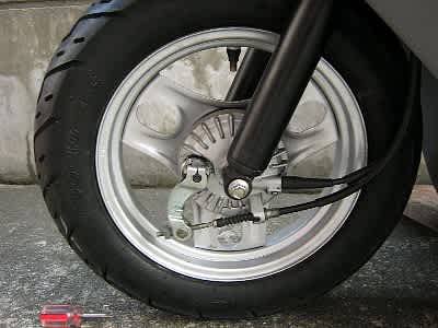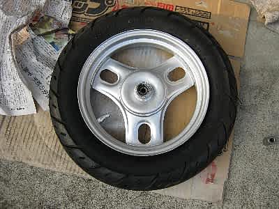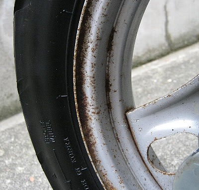 足回りなんて汚れるものですし、スクーターは半分カウルに隠れているのでそう気にするところでもない。でも、車体がキレイな分だけ錆びた前輪のホイールが見窄らしいとオーナー。私にしてもカウルの白焼け等を直して車体を綺麗に整えたものだから、余計に目につくようになりました。