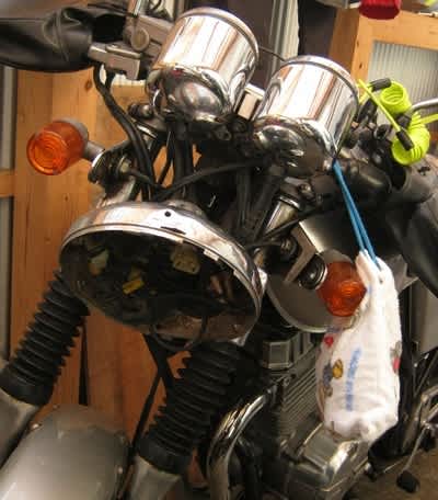 永らく使ってたイエローバルブをサルベージ。視認性・被視認性共に高く気に入っているんですが、GBでは夜滅多に駆しらないことに加えて 昼間も電力消費を抑える為あまり点けません。ボルトメーターを着けてから停車中は電圧低下で警告音が鳴って五月蠅いから。