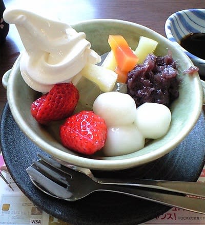 2013-04-30 ソフトいちごあんみつ あいすくりん 夢庵。 少し前の季節限定メニュー。今はマンゴーになってますね。夢庵の濃厚ソフトは満足のいく美味しさです。クリームあんみつも好きなので、つい頼んでしまいます。 評価:○