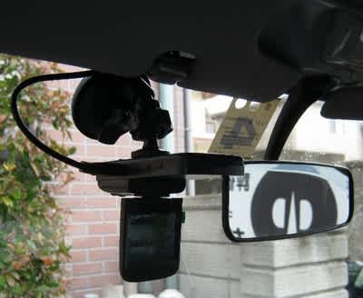 サンバーはバックミラーとフロントガラスの間が狭く、理想的なそこには設置できませんでした。まあしょうがないと写真の位置、助手席サンバイザーに掛かる所に設置。
