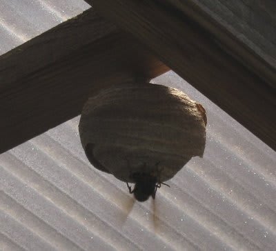 バイク小屋の軒下で既に直径10cm以上。こちらは眼中無いという感じでせっせと営巣するコスズメバチの女王。敵はまだ一匹といえど、シーズン最初の対峙は怖いものです。でもまだ自分でなんとかできる内に なんとかしなくては。