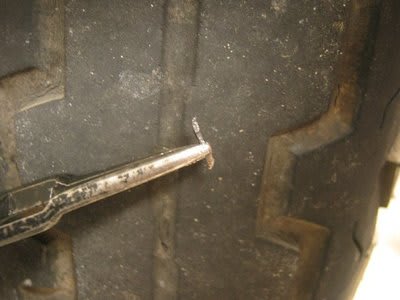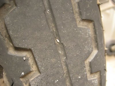 このまま抜いたら空気が抜けて身動きが取れないし、だからと言って捨ておけない。チューブレスだったらさっさとパンク修理しちゃえるんですけどね。尤も、帰ってきてからも抜くのは躊躇しますね。空気が抜けたら即チューブ引っ張り出して自分でパンク修理しなきゃいけない。バイク屋まで走れないわけですから。でも御覧のようにTT100GPは大分溝が無くなってきて「そろそろ替え時だよなぁ、いやでもまだ溝ちょっとあるし」とか思ってたところなんですよ。