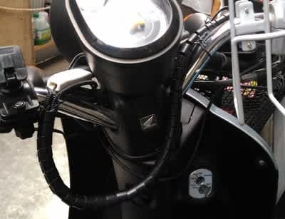 配線処理が格好悪いですが、手元にあったスパイラルチューブで纏めてツイストラップで留めました。これで真冬でも駆しる楽しみが出来ました。