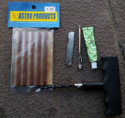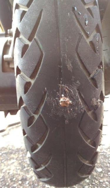 さあ出かけようと思ったらパンク。確認すると異物が刺さってました。といってもコレ、極僅かな金属片で、引き抜いて確認できない程の小さきモノでした。でもここから確実に漏れてる。