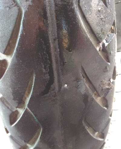 でも漏れもなく塞げました。右側にある膨らみも2年前にやった傷跡。これが僅かに抜けてて2日と持たないんですよね。よくぞここまで引っ張ったもんだw 気が付けばもう換え時ですよねぇ。末期は減り出すと早い。ここまで約7000kmですから持った方です。梅雨頃タイヤ交換だな。