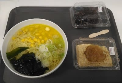 2020-07-15 あられちゃん家 食べ物 旅行 自粛の気晴らしでちょっとだけドライブ。営業再開してたので行ってきました。着いたときは雨だからか空いてました。ラッキー。 食事まで始めたというので。申し訳ない価格帯です。最初、売ってるカプ麺とか使ってるのかと思いましたが、普通にボリュームもあります。色々食べたくなるメニューですね。 塩バタコーンラーメンとおはぎ2個。これで370円ですよ。応援したくなります。あ、この後お決まりのソフトクリーム50円も頂きまして、おかげで気持ちのいいドライブとなりました。